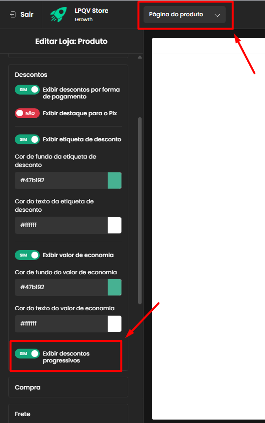 Para ativar o destaque, basta habilitar a opção "Exibir descontos progressivos" no Editor de Temas da Loja Virtual na página do produto, na seção de "Descontos", e depois clicar em "Salvar":