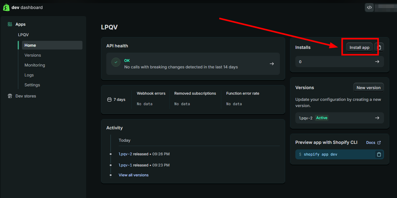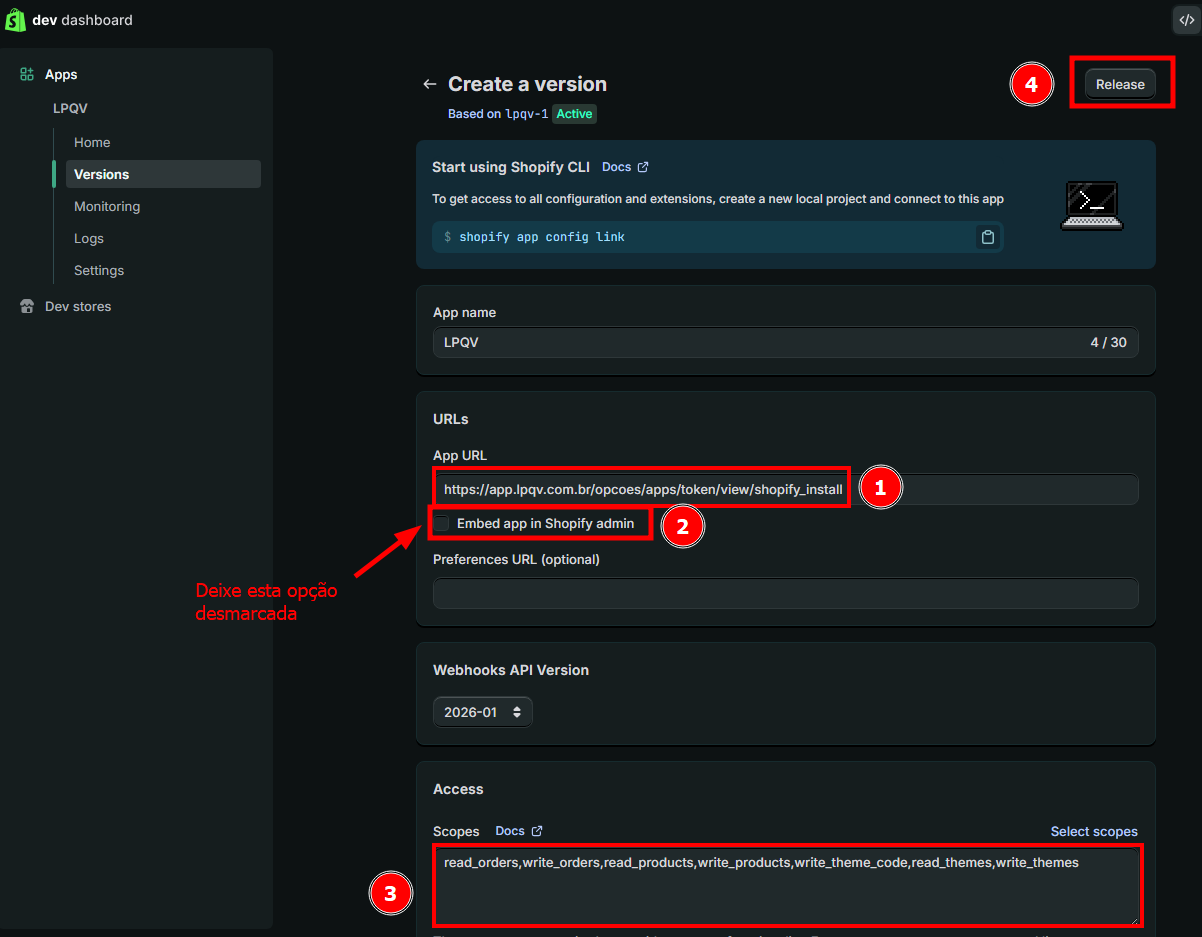 - Secret: Cole o Secret que será copiado na Shopify, na tela do Dev Dashboard > "Settings".