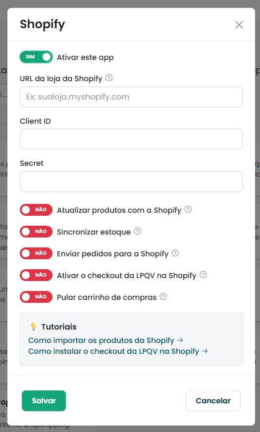 - Enviar pedidos para a Shopify: Habilite esta opção, assim os pedidos realizados na LPQV serão enviados para a Shopify.