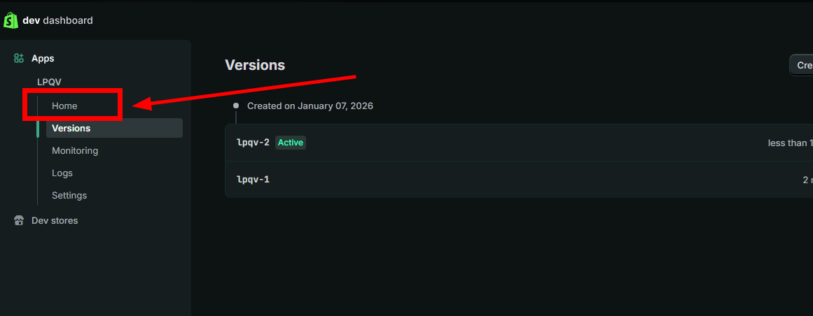 Primeiro, em sua conta Shopify, acesse o menu "Desenvolvimento de apps" e clique em "Desenvolver apps no Dev Dashboard":
