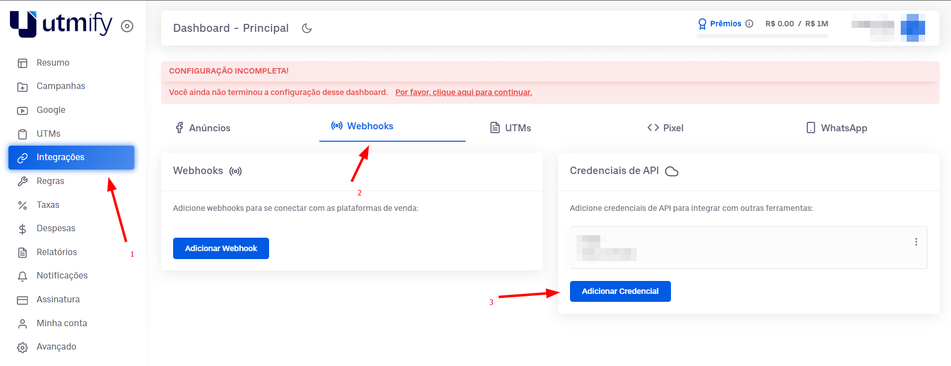 1) Em sua conta na plataforma Utmify, acesse o menu "Integração", clique na opção "Webhooks" e depois clique em "Adicionar Credencial":