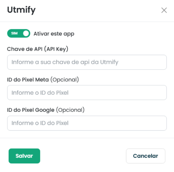 5) Na última etapa, ative o App e no campo "Chave de API (API Key)" cole a credencial copiada do painel Utmify. Os outros dois campos são de preenchimento opcional; caso queira informe o ID do Pixel Meta e/ou o ID do Pixel Google para que na Loja Virtual, Landing Page e checkout, o script seja automaticamente carregado. Por fim, clique em "Salvar":