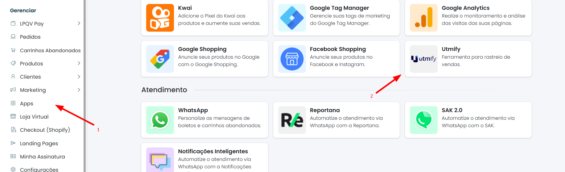 4) Em seu Painel LPQV, acesse o menu "Apps" e clique na opção "Utmify":