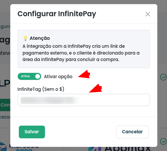 Configurar InfinitePay (Link de pagamento externo) na LPQV